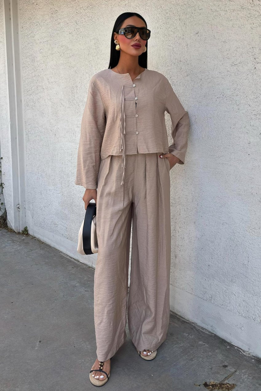 Thin Front Cord Detail and Double Leg Trouser Suit Beige