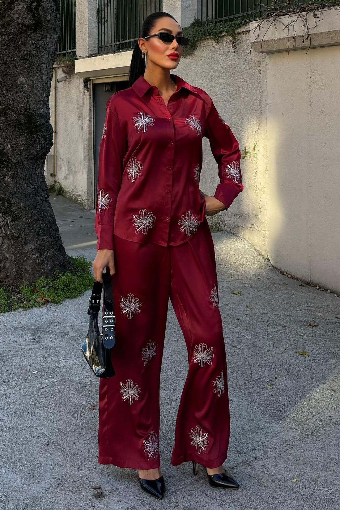 Sequined Glittery Floral Satin Two-Piece Suit Red