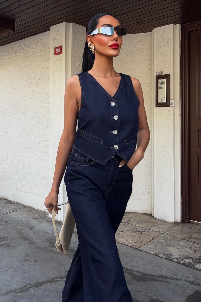 Denim Suit with Vest and Palazzo Pants Dark blue