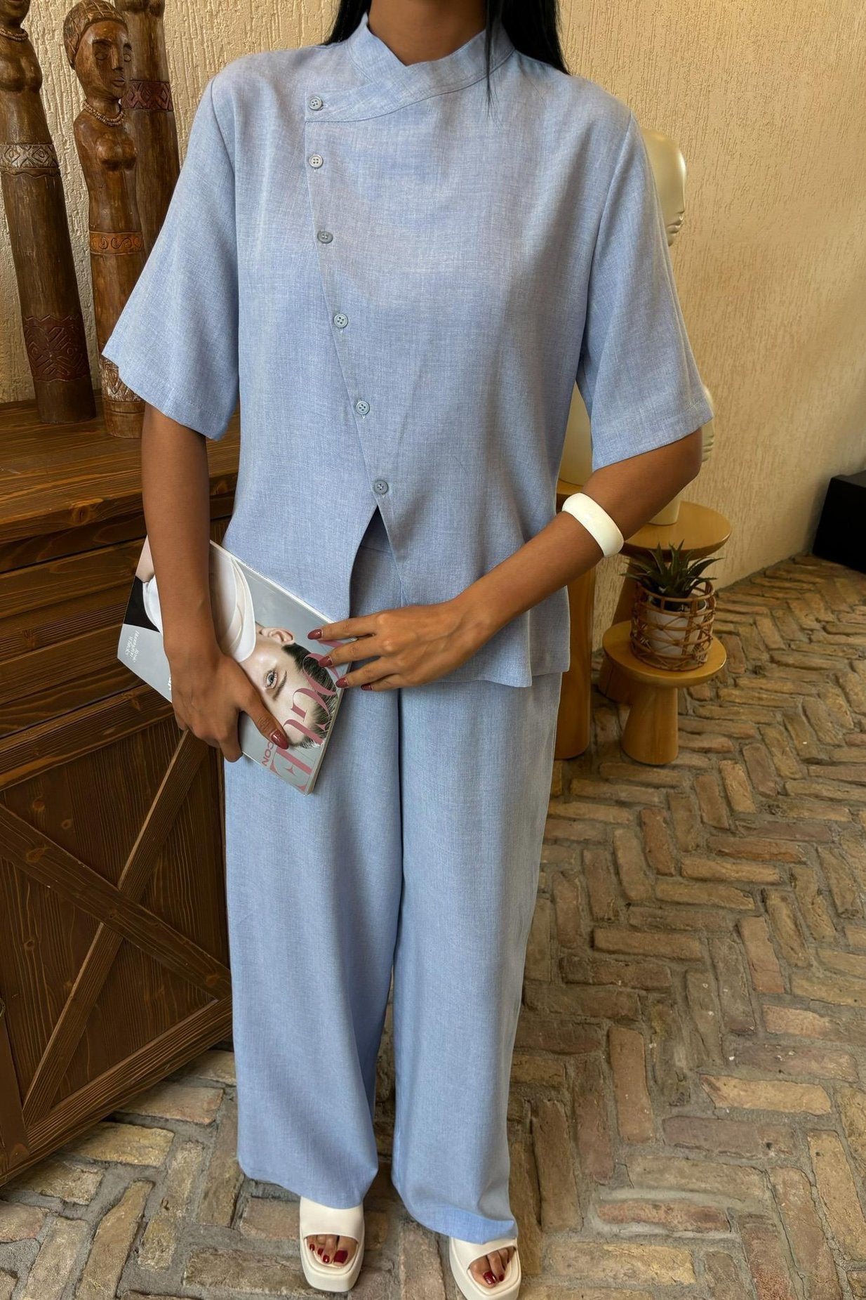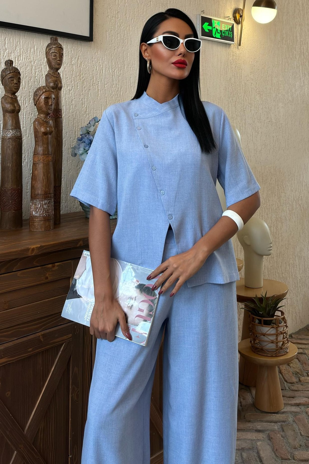 Grandad Collar Cross-Button Plazzo Trousers Viscose Linen Suit