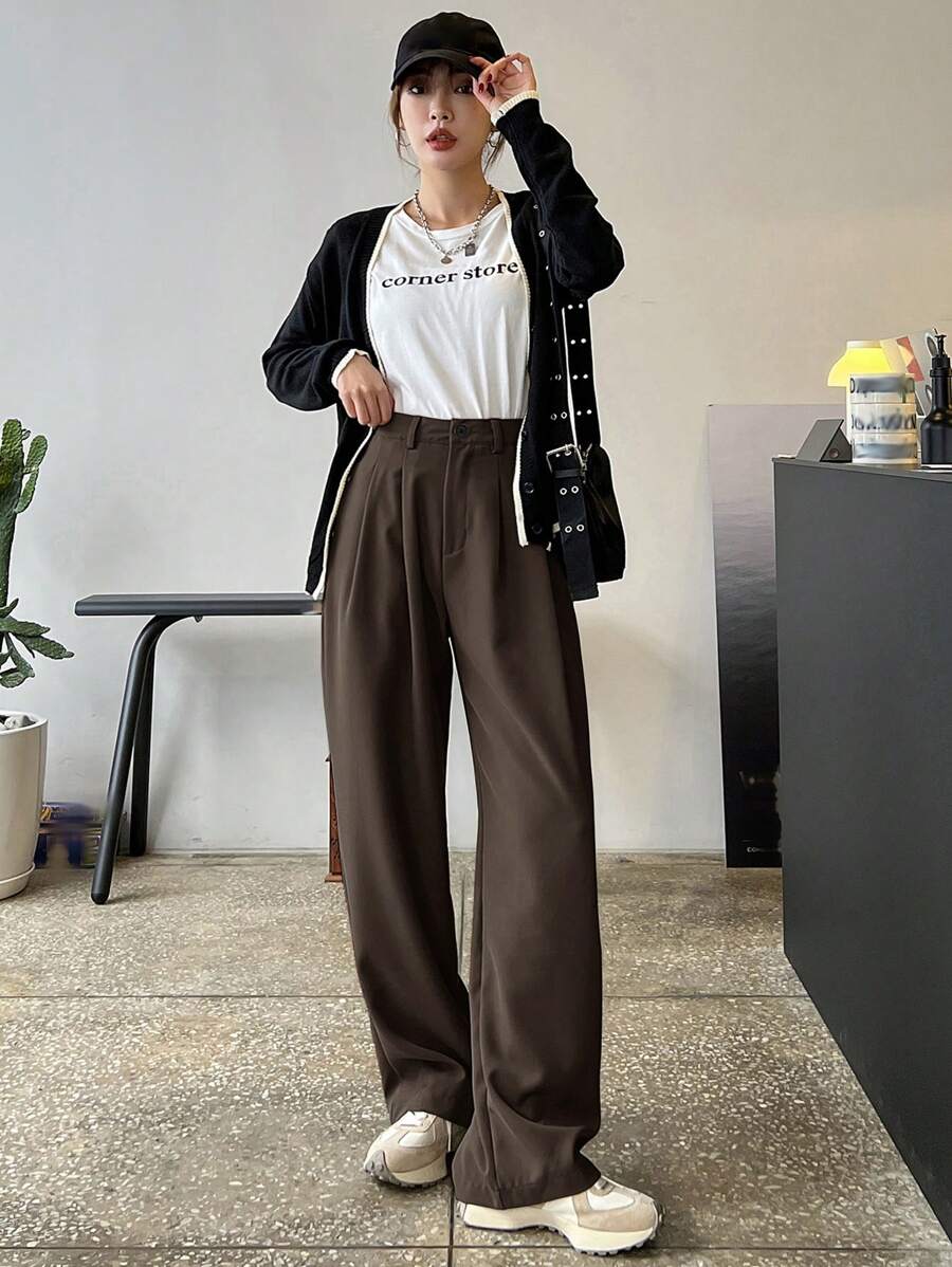 Lycrox Women's Solid Color Pleated Straight Leg Business Casual Pants - Brown